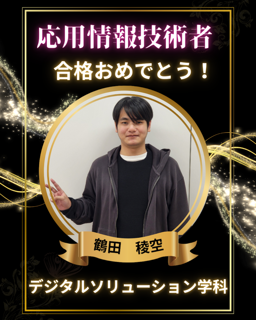 2026.01.07 1年生が応用情報技術者試験に合格! 本学デジタルソリューション学科1年・鶴田稜空(つるた りく)君が、応用情報技術者試験に合格しました。 1年次での合格は非常に難易度が高く、日頃の学習姿勢と強い探究心の成果です。 今後のさらなる成長と活躍を期待しています。
